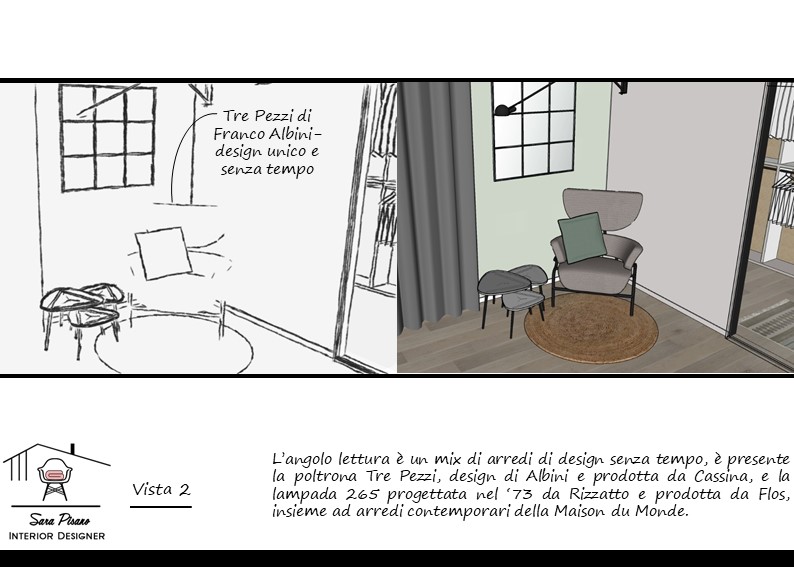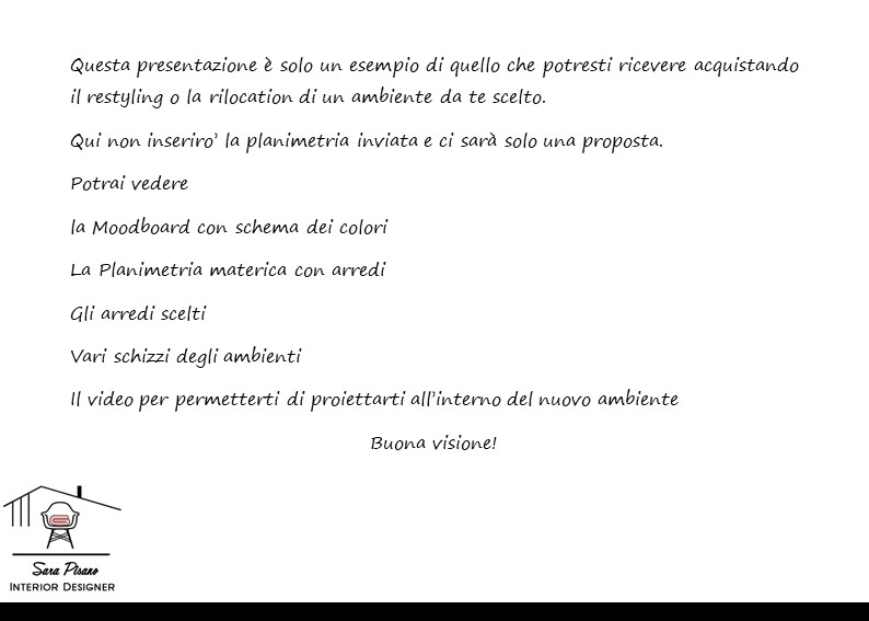 Il primo step consiste nell’invio da parte tua della planimetria con delle misure dell’ambiente che vuoi arredare, puoi scegliere tra tenere gli stessi arredi e modificare solo la disposizione, cambiare gli arredi in base al budget indicato da te oppure decidere insieme cosa cambiare e cosa comprare. I file che riceverai saranno due o tre proposte con la moodboard degli ambienti richiesti, la planimetria con gli arredi, lo schema dei colori, degli schizzi e dei Rendering 3D, la lista degli acquisti e il video per farti entrare in anteprima nel nuovo ambiente! Le proposte saranno dei book con indicate tutte le spiegazioni delle scelte fatte.
