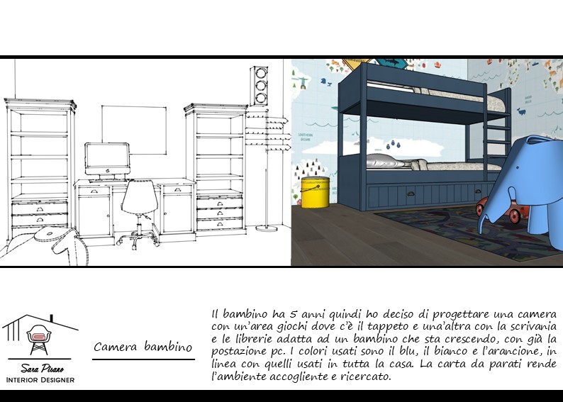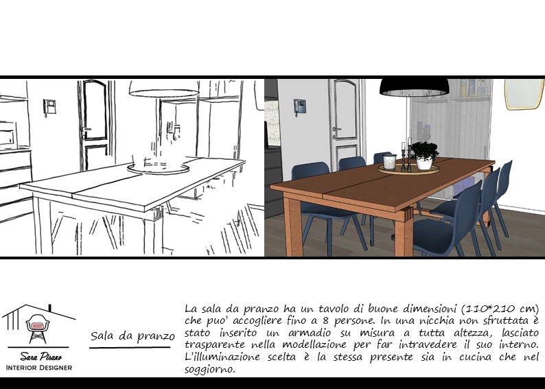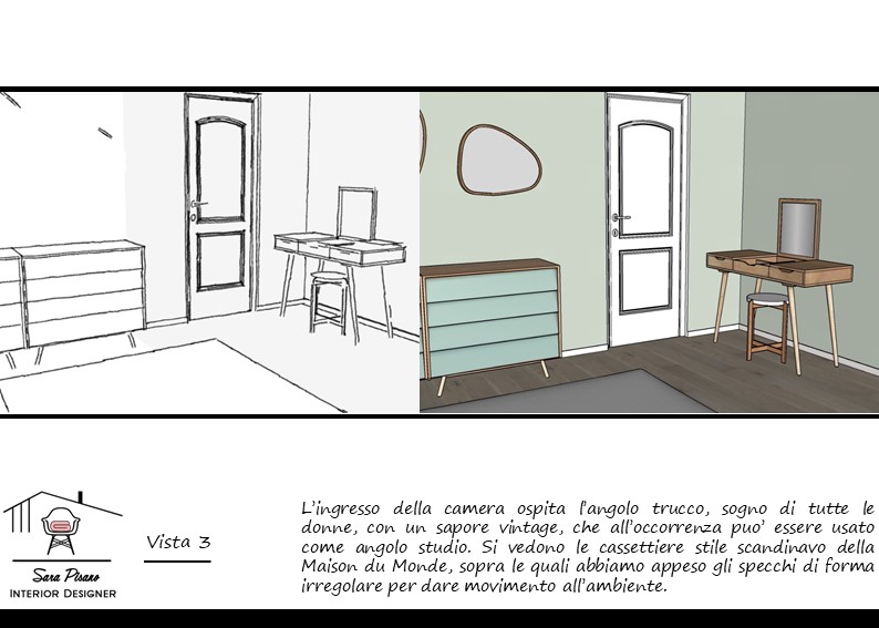 Il colore è l’anima del progetto e grazie a lui possiamo creare un fil rouge nel nostro progetto. Con piccoli accorgimenti renderò l’ambiente accogliente e di nuovo bello. Le proposte saranno due e saranno composte da una selezione di immagini dalle quali prendere spunto, lo schema dei colori e delle rappresentazioni 3D con i nuovi colori.